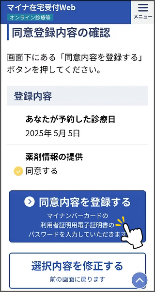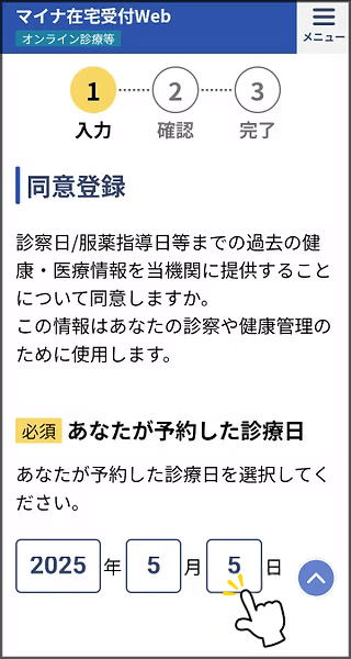 3予約した診察日を入力、スクロールし同意登録へ。